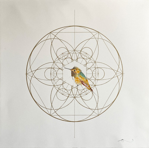 | Medium: | Gold Screen Printed Geometry with Pencil and Acrylic Painted Hummingbird. |